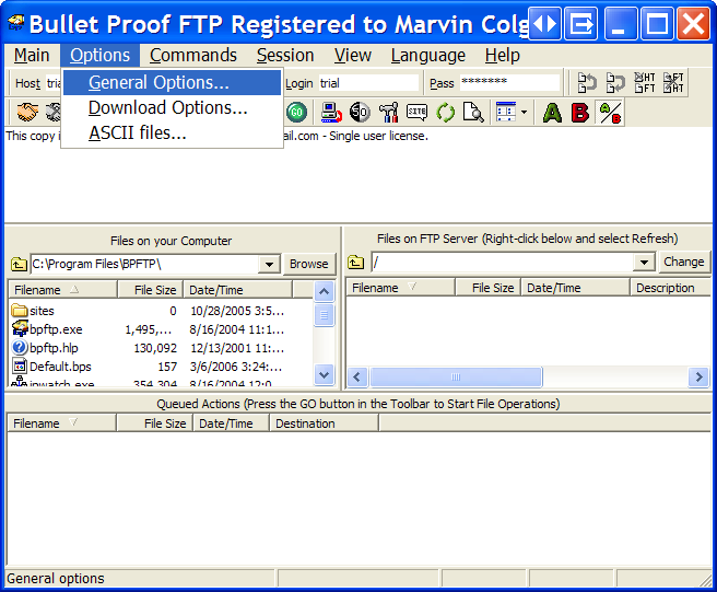 Step 2 From BulletProof FTP Client's main user-interface, pull-down and select Options -> General Options.... |