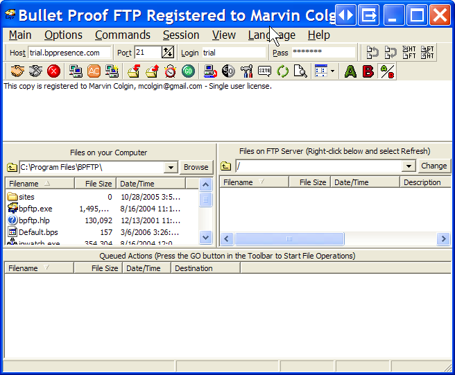 Step 1 Start BulletProof FTP Client from the Windows Start-Menu and make sure you can clearly see it's main user-interface. If you do not have BulletProof FTP Client installed on your computer, you can download a fully functional trial version from our website (http://www.bpftp.com). |