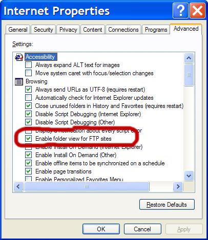 4. Find the setting labeled Enable folder view for FTP Sites and make sure it has been checked-on.